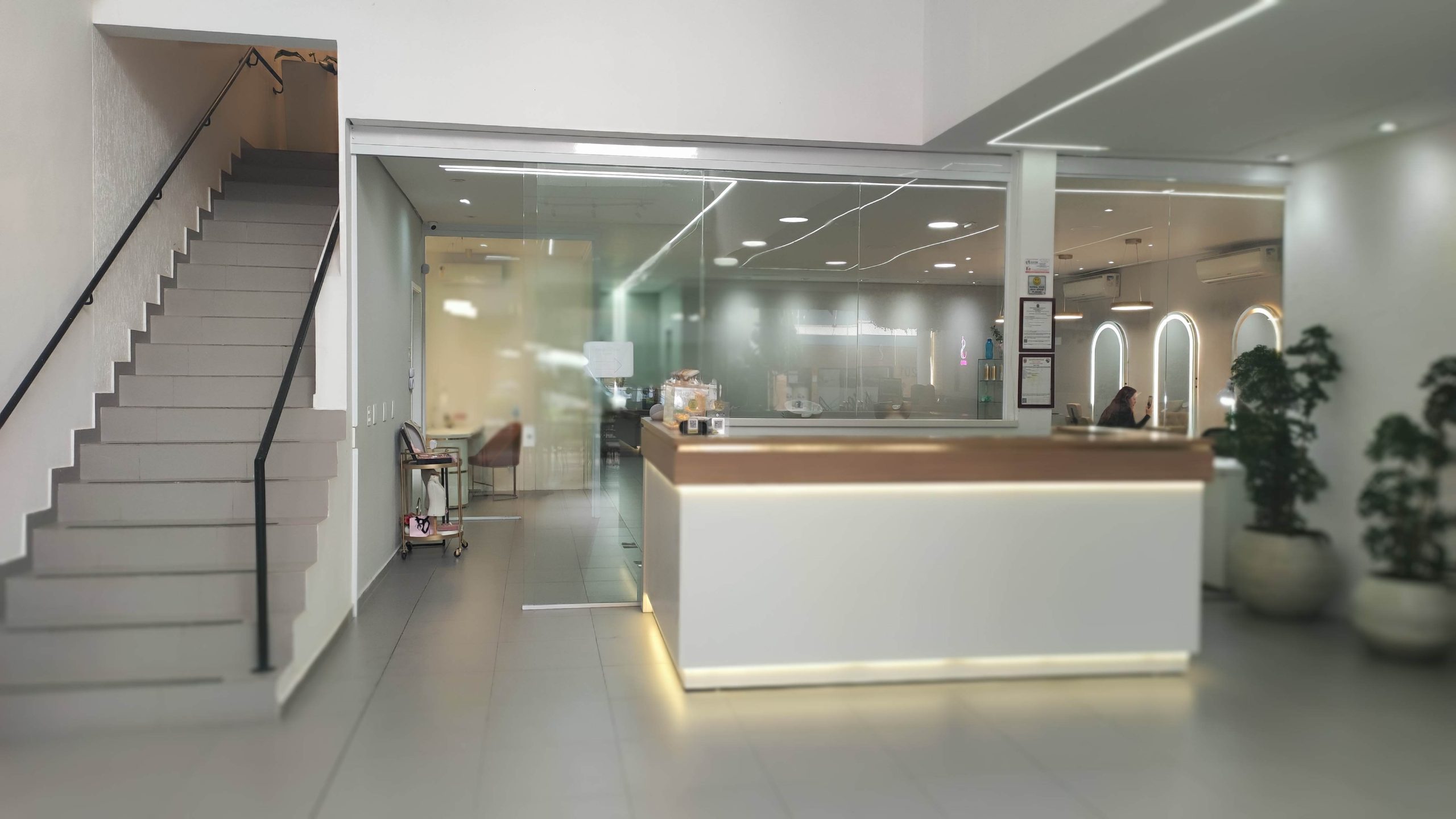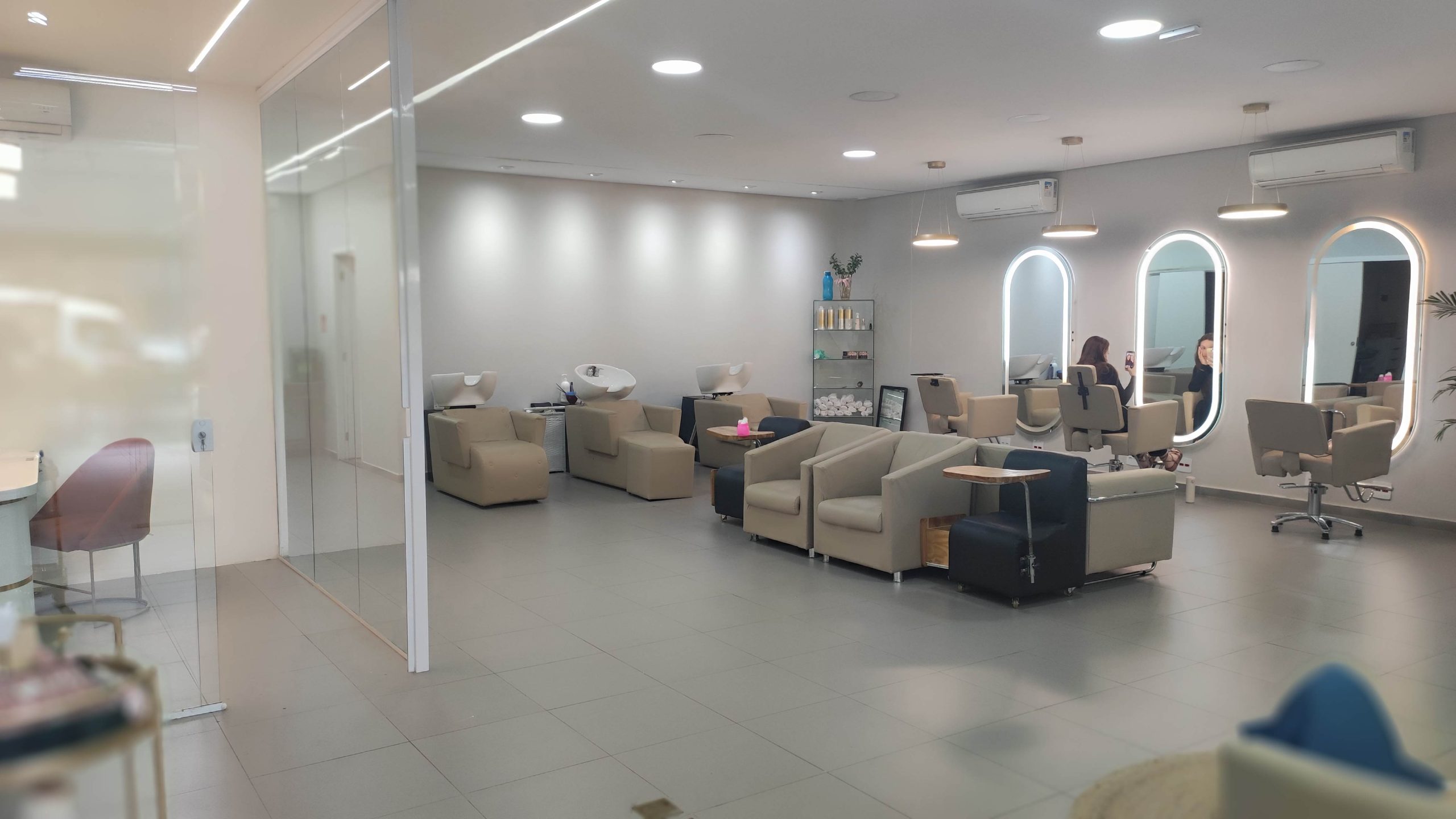 Nos ambientes de beleza, o design moderno e minimalista convida ao cuidado e ao bem-estar, com poltronas elegantes, espelhos iluminados e atendimento de alto padrão.