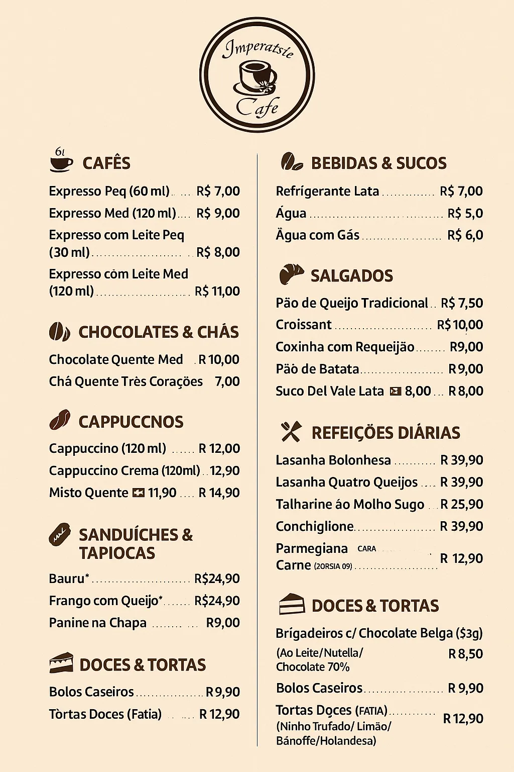A Imperatriz Café, no Winner Office (Vila Leopoldina), é um espaço moderno que combina cafeteria e ambiente de trabalho. Com tomadas, cantinho para laptops e área externa com cachoeira, oferece conforto para quem trabalha remoto. O cardápio inclui salgados, doces, bolos, brigadeiros e opções leves como omeletes e tapiocas. Um lugar aconchegante para trabalhar, relaxar e apreciar boa comida.
